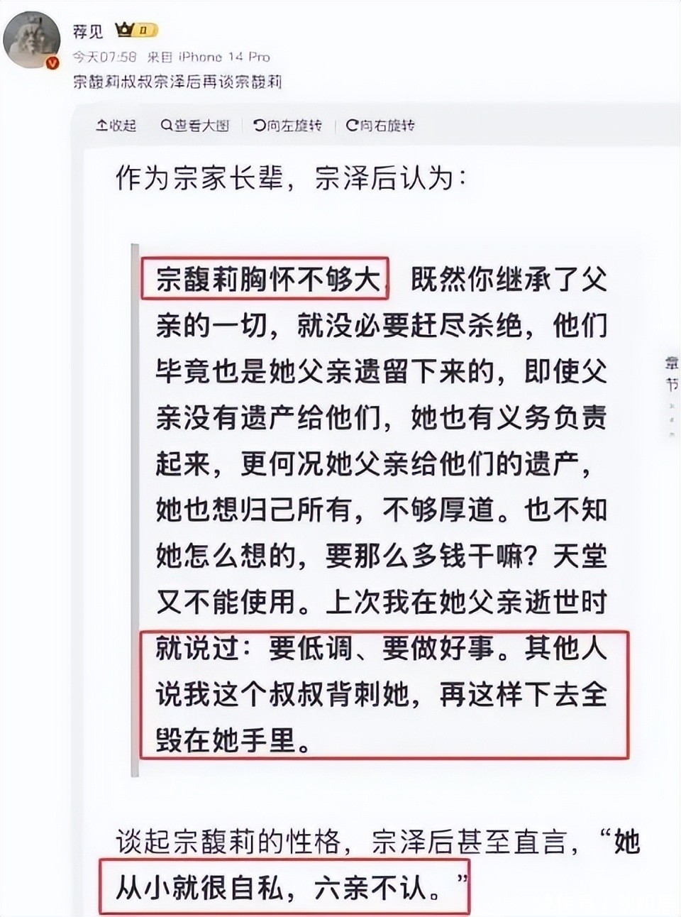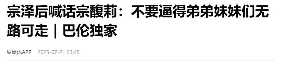 从某种意旨上说,这种行为可被视作“参加他东谈主家庭”,若非情况出奇,很难幸免社会公论压力。 而宗泽后手脚宗庆后的亲弟弟,不仅未营救宗馥莉这位正当收受东谈主。